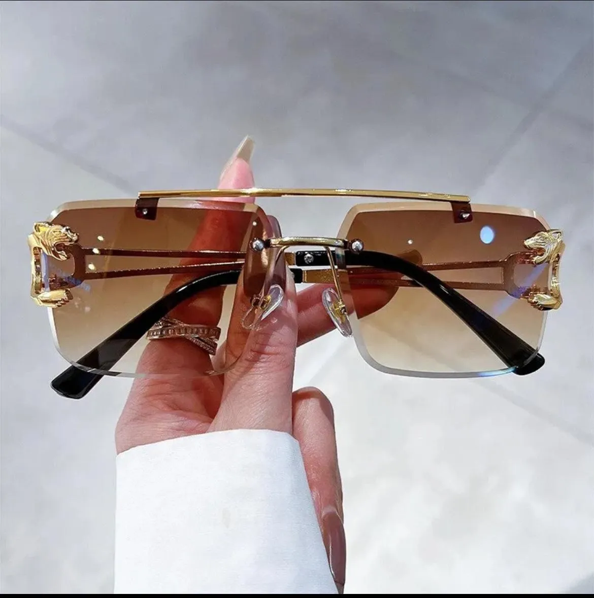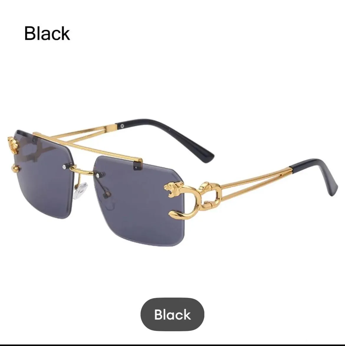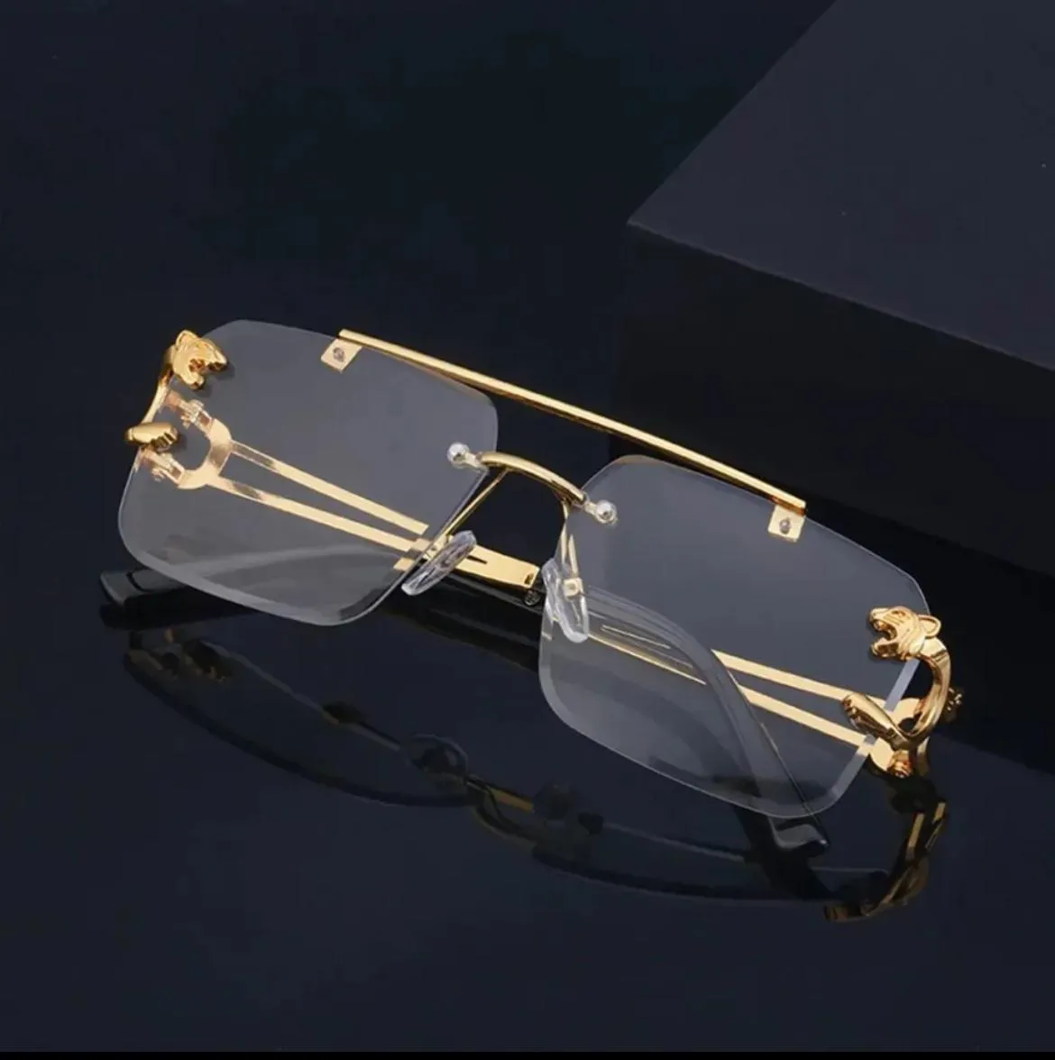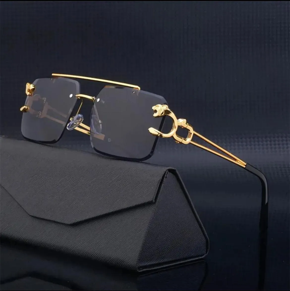 Upgrade your style with these Luxury Rimless Sunglasses for Men, crafted with a stunning gold metal frame and a unique panther-inspired side design that adds a powerful and elegant touch. The rimless construction gives the glasses a modern, high-end appearance while keeping them lightweight and extremely comfortable to wear.